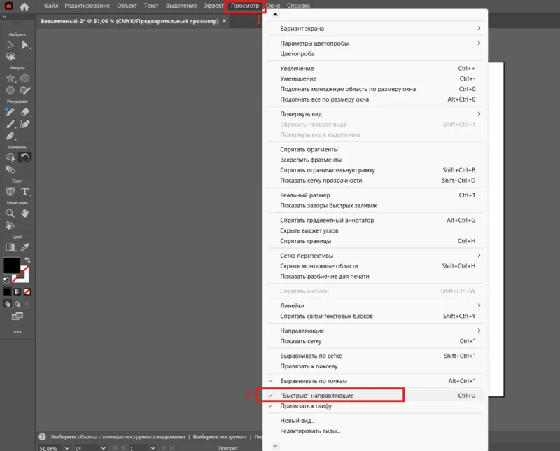 Включается через верхнее меню: «Просмотр» → «Быстрые направляющие» (View → Smart Guides).