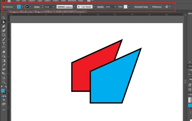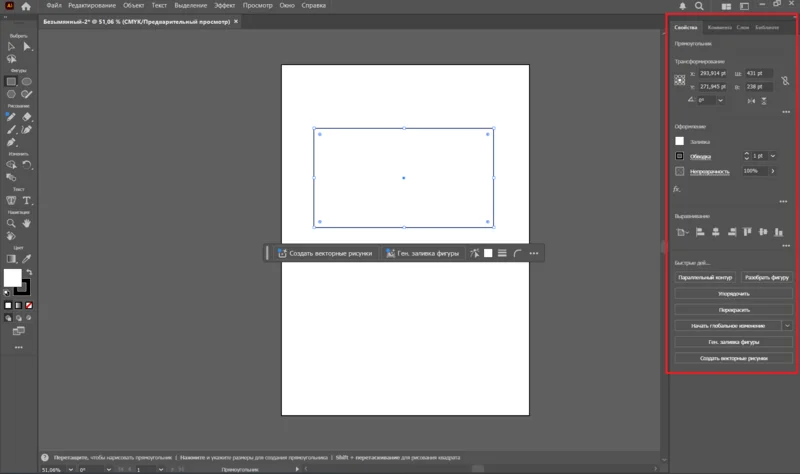 Панель свойств (Properties) справа — блок, который показывает параметры выбранного объекта: размеры, положение, цвет, обводку, выравнивание и быстрые действия. Это одна из панелей, которыми пользуются чаще всего. Обратите внимание, что на более старых версиях Adobe Illustrator она отображается под верхним меню.