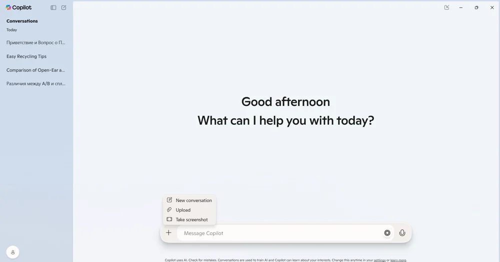 Только в приложении Copilot на ПК можно использовать ИИ-помощника в Microsoft 365, о котором заявляет компания. Вот как выглядит интерфейс приложения.