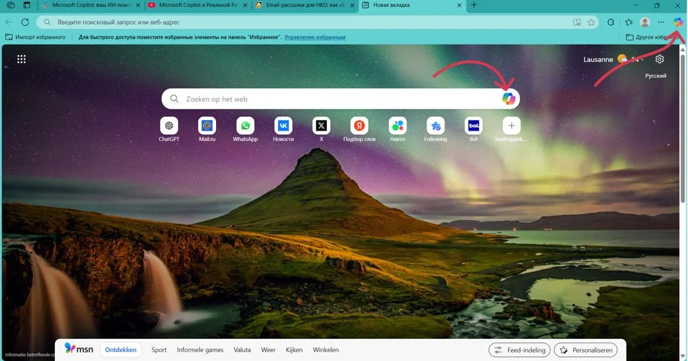 В Edge есть значок Copilot рядом с поисковой строкой и в правом верхнем углу.