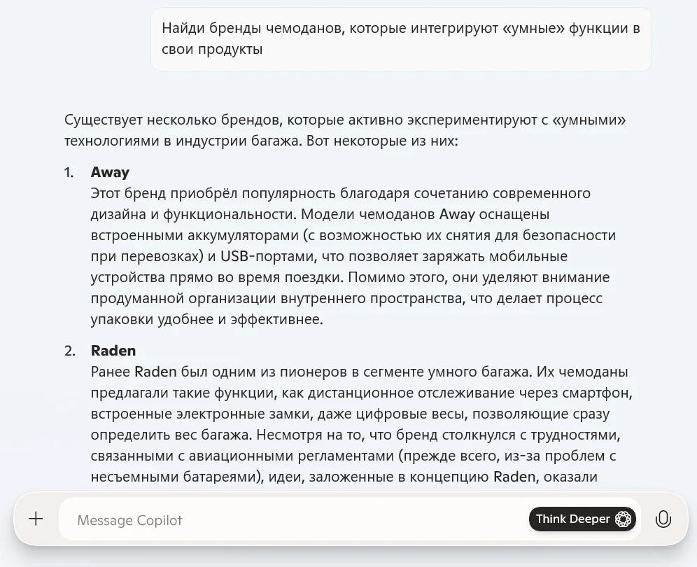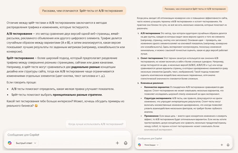 Выбрать формат ответа. Варианта два. «Быстрый ответ» подходит для повседневных запросов, сервис присылает текст на пару секунд. Think Deeper подходит для более сложных вопросов и отнимает больше времени. Эта функция не то же самое, что Deep Research у других нейросетей. Copilot просто дает чуть более подробный ответ, но не проводит полноценное исследование, как ChatGPT или DeepSeek.