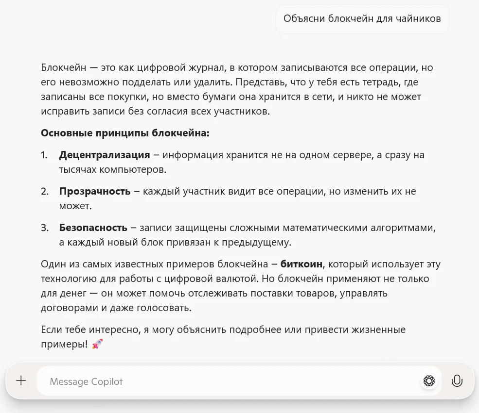 Ответы на вопросы. Copilot найдет информацию обо всем — от мелочей до рабочих задач. Простые вопросы вроде «Какая погода летом в Москве?» решаются мгновенно. Сложные темы тоже по силам: «Объясни блокчейн для чайников» даст понятное описание с примерами.