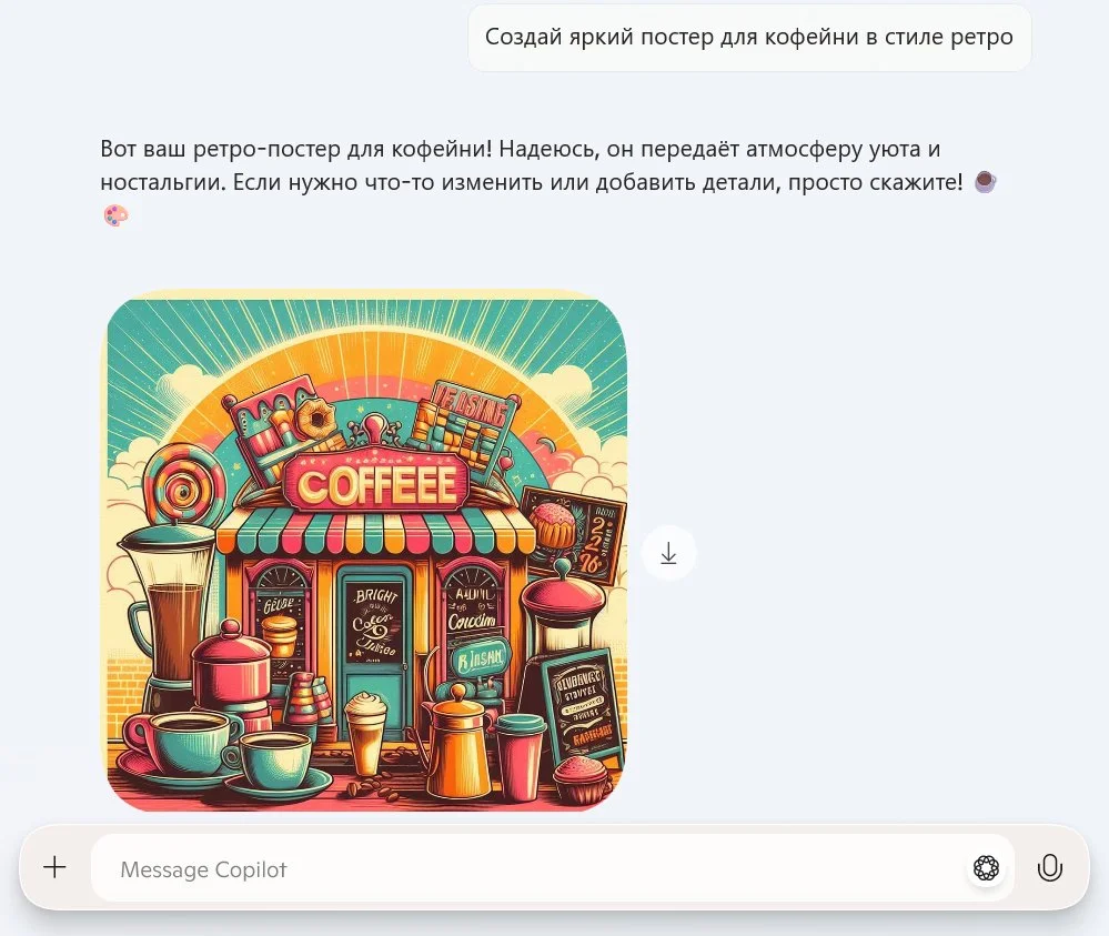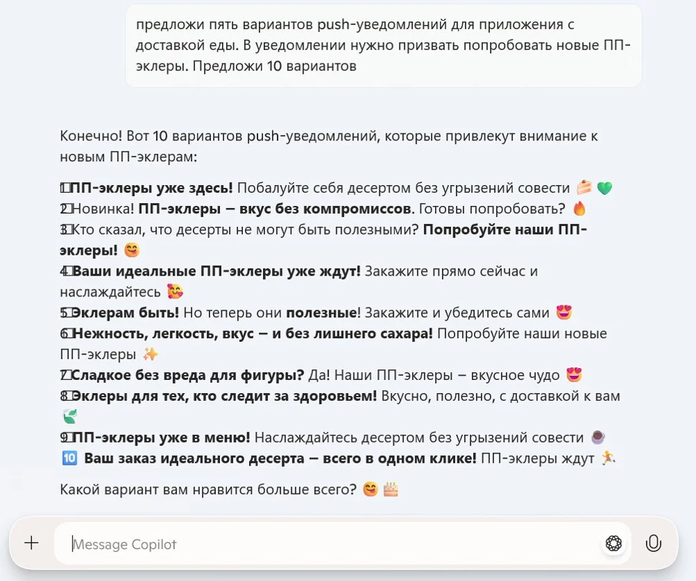 Контент. Copilot пишет посты, подписи к фото и короткие уведомления. На запрос «Напиши пост о запуске продукта» выдаст текст для соцсетей с призывом к действию. Для подписей запросите «Опиши фото кофейни для Instagram*» — бот выдаст атмосферный текст.