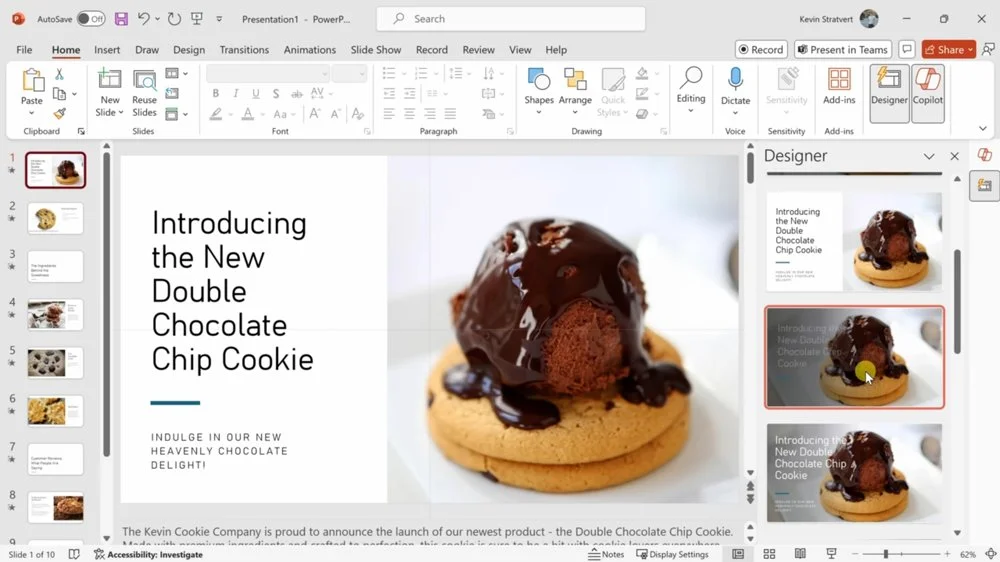 Если базовая верстка не устраивает, можно использовать встроенную функцию «Дизайнер», которая переработает слайды: система предложит варианты расположения изображений, форматирования текста и идеи для фона.