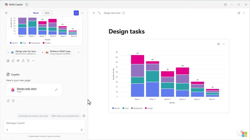 Chat. В этом разделе вы вводите запросы, получаете ответы от ИИ и запускаете разные функции. Например, можете попросить Copilot создать интерактивный график на основе данных из Excel, который затем доработаете прямо в чате или преобразуете в живую страницу для совместного просмотра с коллегами.
