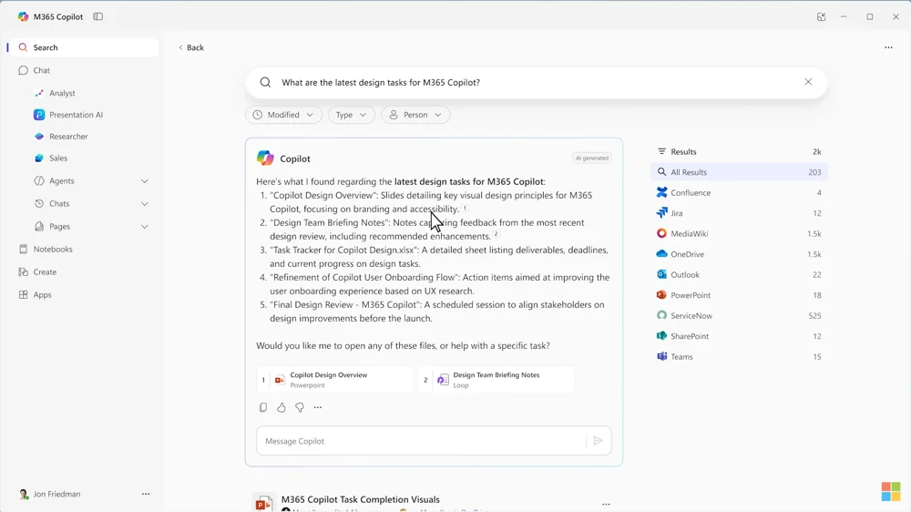 Search. Умный поиск, который объединяет данные из файлов, email и веб-ресурсов. Например, можно ввести запрос о продажах за квартал, и Copilot выдаст краткий обзор с цифрами из Excel и ссылками на переписку. Правда иногда поиск включает лишние результаты.