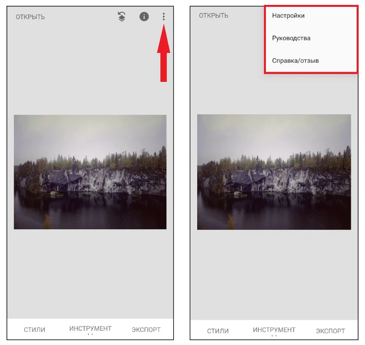 Под иконкой с тремя точками скрыт раздел настроек и справочная информация. В «Руководствах» есть мини-гайды по обработке фото в популярных стилях, а «Справка» содержит ссылки на мануалы, юридическую информацию и форму обратной связи с разработчиками.
