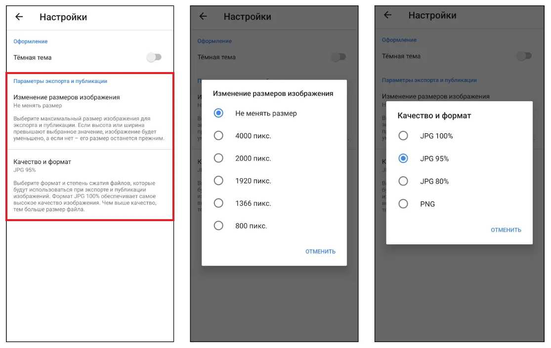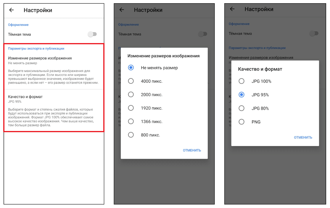 В разделе настроек можно изменить параметры экспорта и публикации изображений. Например, установить определенный размер, выбрать формат и качество файлов.