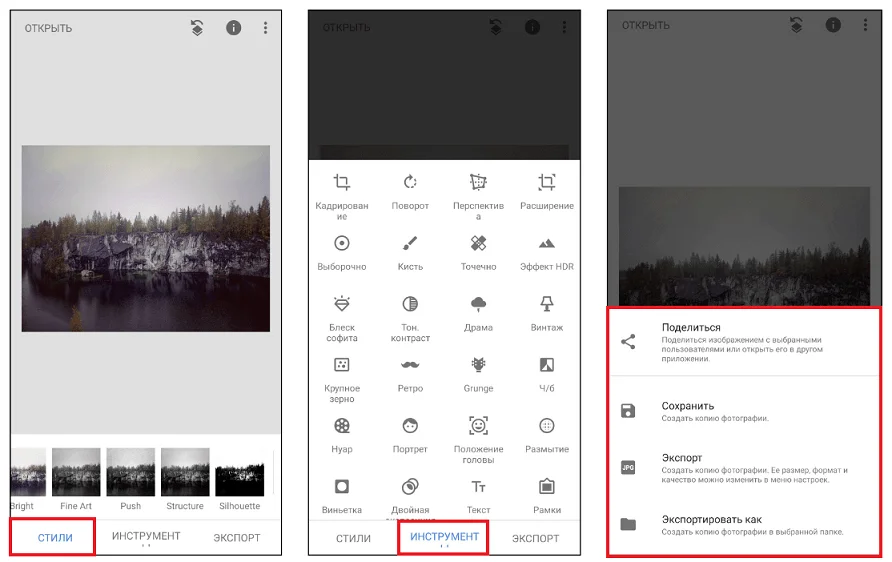 В приложении Snapseed для Android можно сохранять обработанные фото себе на устройство, а также отправлять их своим контактам в мессенджерах и соцсетях. Все изменения, включая фильтры, цветокоррекцию и ретушь, сохраняются.