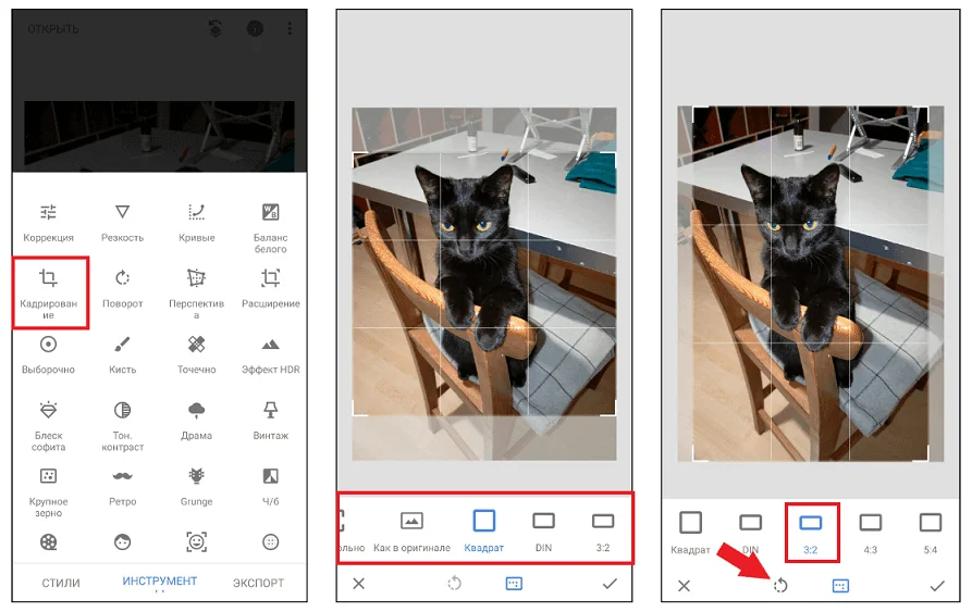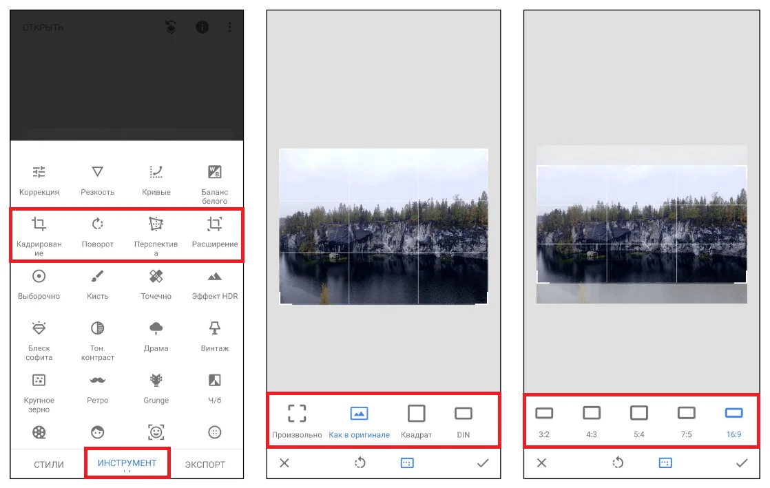 Инструмент «Кадрирование» в Snapseed обрезает изображение под нужное соотношение сторон — например, 1:1, 4:3, 16:9. Просто выберите подходящий вариант из списка и нажмите на галочку внизу экрана, чтобы применить изменения.