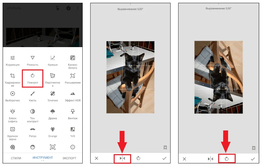 В разделе «Инструменты — Поворот» можно повернуть снимок на 90 и 180°, отразить по горизонтали.