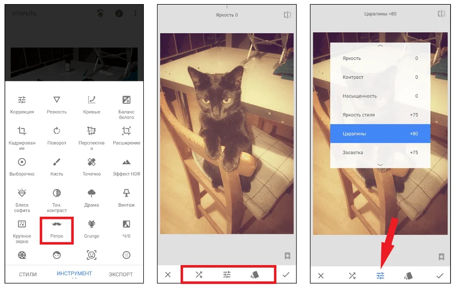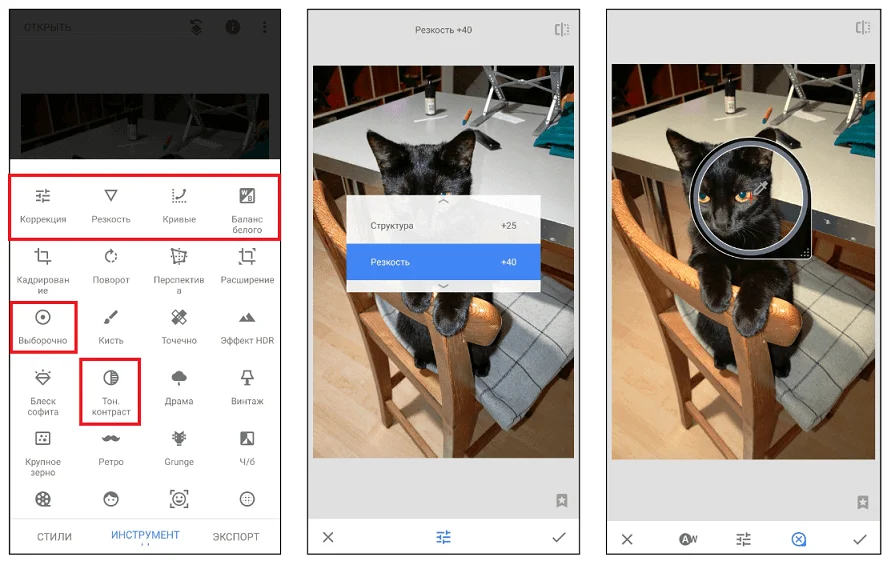 В инструментах Snapseed есть готовые художественные фильтры, а также регулируемые эффекты: размытие, виньетка, текстуры и световые акценты. Их можно использовать вместе со стилями, создавая уникальные пресеты.
