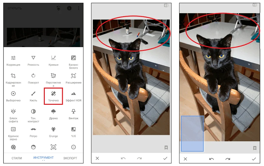 Если хотите убрать лишние объекты на фото, воспользуйтесь инструментом точечного удаления. Учтите, что ширина ластика не настраивается. Придется масштабировать снимок и аккуратно стирать ненужные элементы, чтобы не задеть соседние предметы.