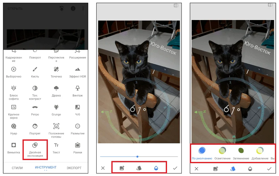 В Snapseed есть инструмент двойной экспозиции, который позволяет накладывать одно изображение на другое, менять его прозрачность, расположение на фото.