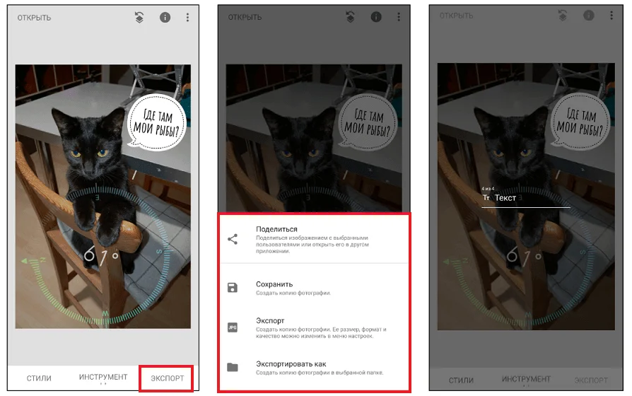 Чтобы сохранить изображение, перейдите в раздел «Экспорт» и выберите нужное действие. Если хотите сохранить оригинал фото, нажмите на «Сохранить копию» — Snapseed создаст новый файл с примененными фильтрами и корректировками, не меняя исходное изображение.