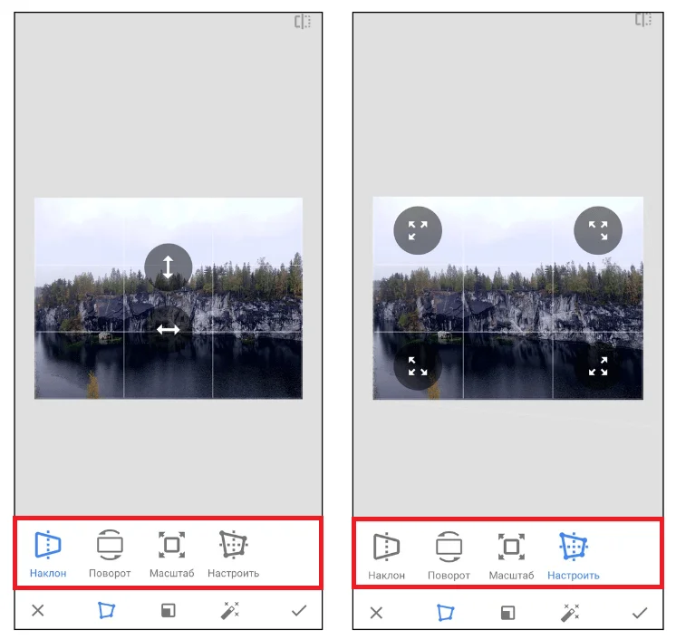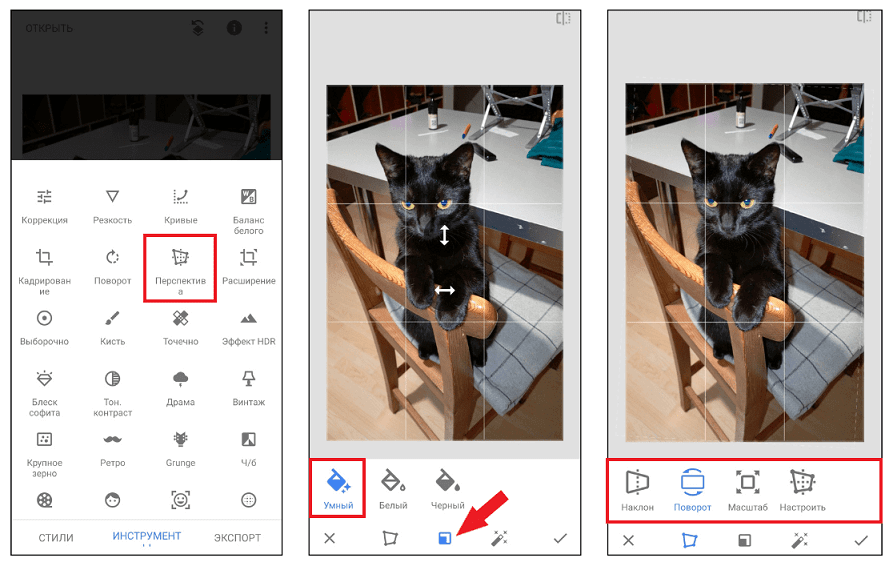 Для исправления горизонта откройте изображение, выберите инструмент «Перспектива» в нижнем меню и задайте дополнительные настройки. Перетащите ползунок или используйте сетку, чтобы выставить нужный угол, а затем нажмите галочку внизу экрана и сохраните изменения.