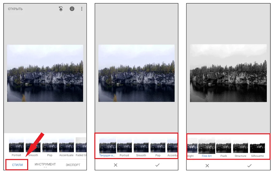 После скачивания приложения изучите интерфейс Snapseed — на Android он простой и интуитивно понятный.
