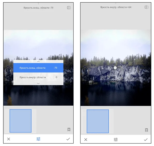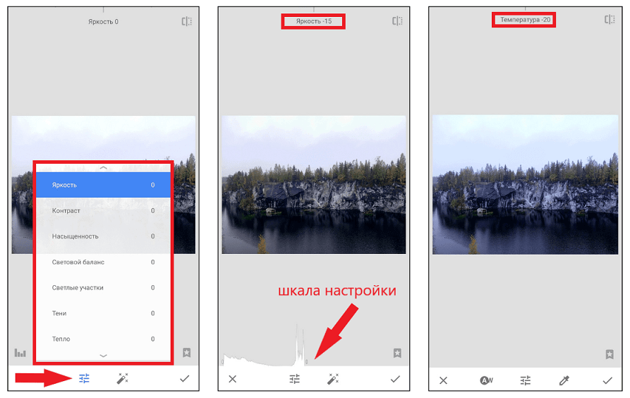 Инструменты цветокоррекции в Snapseed позволяют настраивать яркость, контраст, насыщенность, баланс белого. Также можно изменить резкость, температуру и оттенок, сделать выборочную коррекцию — например, осветлить только передний план или усилить цвет неба, не затрагивая остальные элементы на фото.