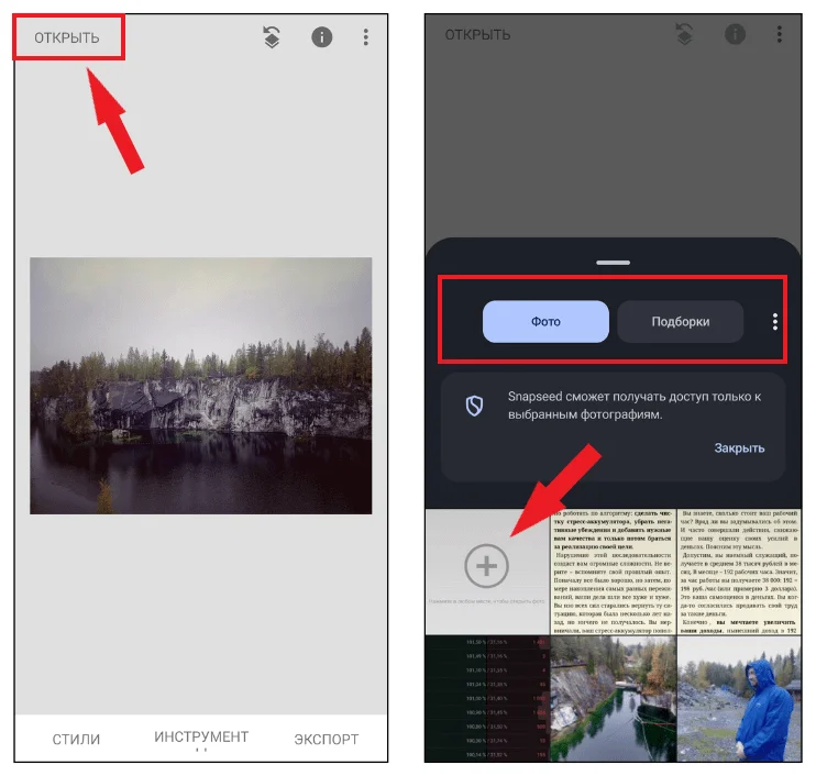 В левом верхнем углу расположена кнопка «Открыть» для загрузки фото. После клика открывается контекстное меню с двумя разделами: «Фото» — последние снимки с камеры, «Подборки» — файлы из всех незапароленных папок на вашем устройстве. Кликните по любому файлу, и Snapseed мгновенно перенесет его в рабочую область. Можно приступать к обработке.