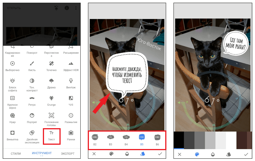 Обработанное фото можно дополнить надписью с помощью инструмента «Текст». В Snapseed есть несколько десятков настраиваемых шаблонов — приложение позволяет менять цвет шрифта или подложки, размер, прозрачность, позиционирование на фото. Удобно создавать простые баннеры или накладывать водяные знаки.