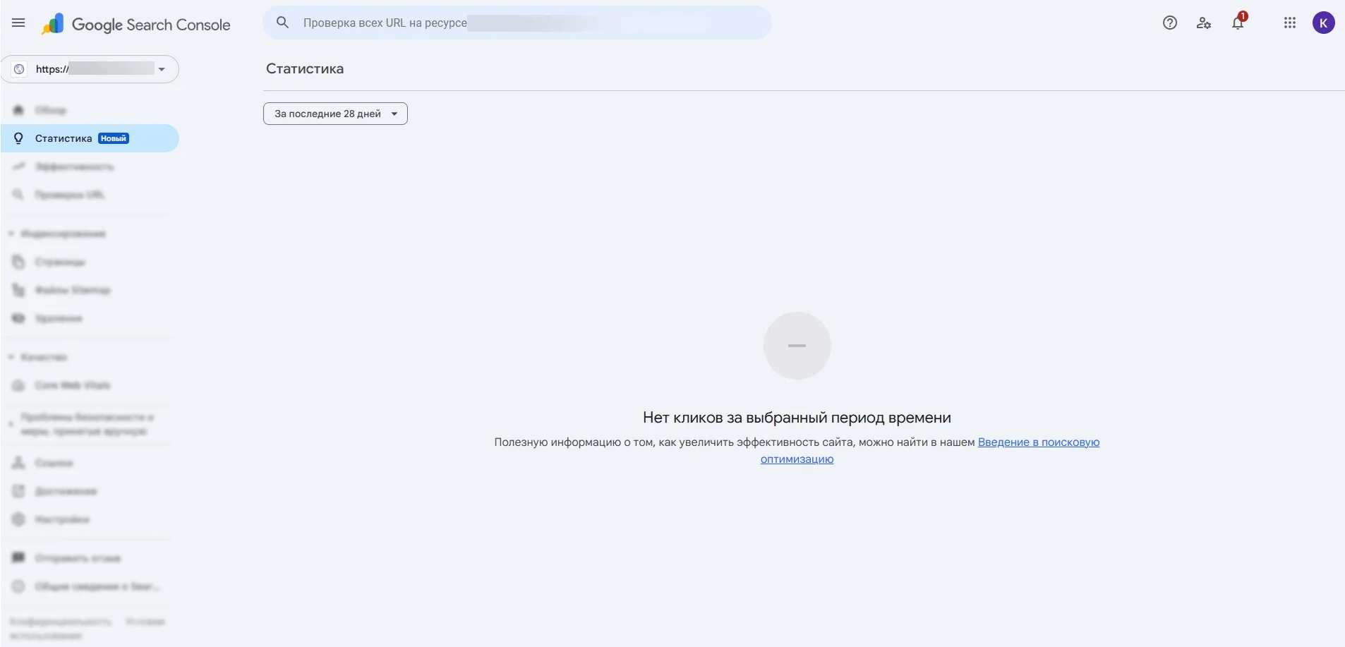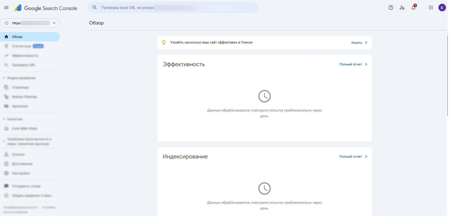 После добавления сайта посмотрим на интерфейс Google Search Console: