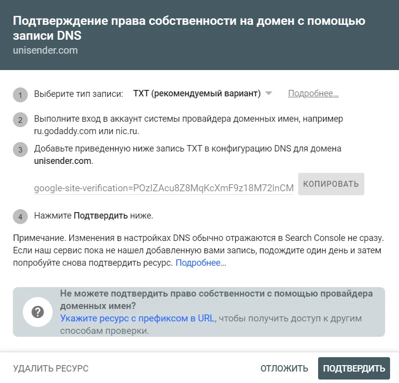 Подтвердить владение сайтом через доменный ресурс можно через DNS. Для этого впишите в поле доменное имя → скопируйте полученный текст → внесите её в конфигурацию DNS своего домена → нажмите «Подтвердить».