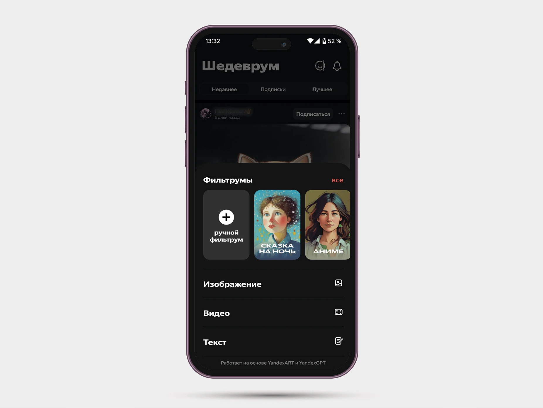 В мобильной версии. После регистрации в приложении нажмите «плюсик» внизу экрана. Выберите «Изображение» и впишите свой промпт. Здесь есть несколько параметров:
