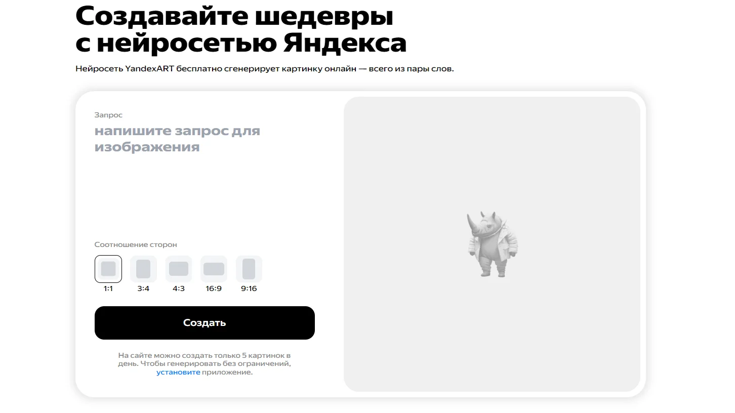 На десктопе. Перейдите на сайт сервиса и авторизуйтесь через Яндекс ID. Нажмите на кнопку «Создать» в правом верхнем углу — появится окно для ввода текста. Напишите промпт: что хотите увидеть, в каком стиле должно быть изображение, какой фон, цвета и так далее. Выберите соотношение сторон изображения: 1:1, 3:4, 4:3, 16:9 и 9:16. Затем нажмите «Создать». Картинка генерируется меньше, чем за 10 секунд.