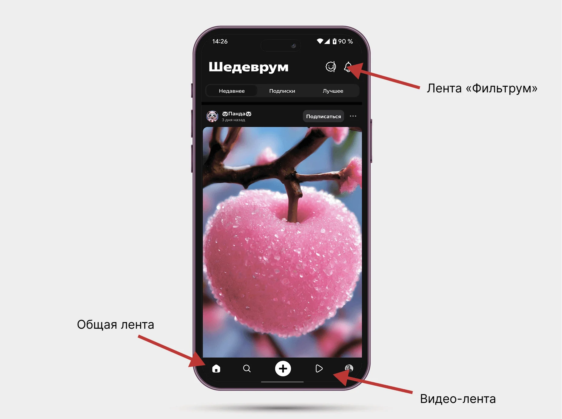 Общая лента. Здесь идут все генерации пользователей подряд: фото и видео. Текста и фильтров нет. Можно смотреть свежие картинки и видео только тех, на кого вы подписаны, или популярные посты.