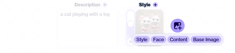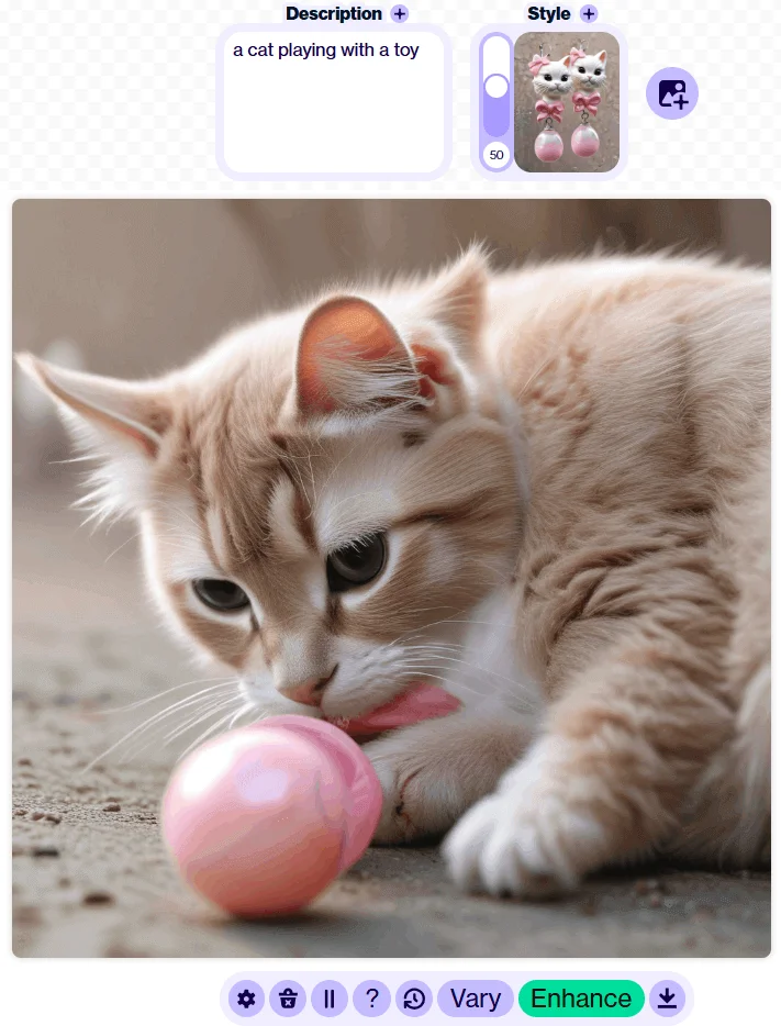Например, пишем промпт: “a cat playing with a toy”. Дальше указываем, что хотим позаимствовать у другой картинки: стиль, лицо, содержание или базовое изображение. В нашем примере будет стиль.