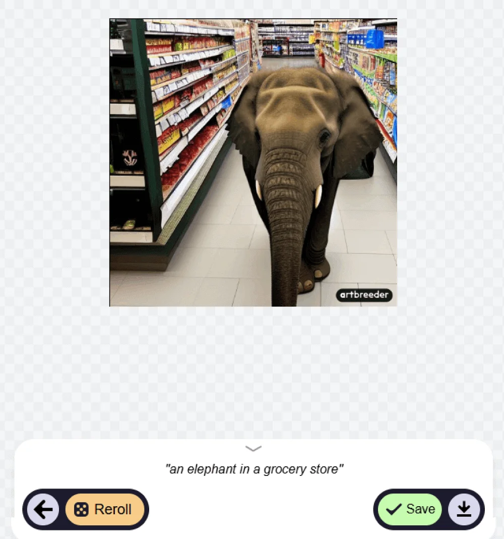 Пишем текстовый промпт: “an elephant in a grocery store”. Нажимаем кнопку Render. Получаем коллаж со слоном в продуктовом магазине.