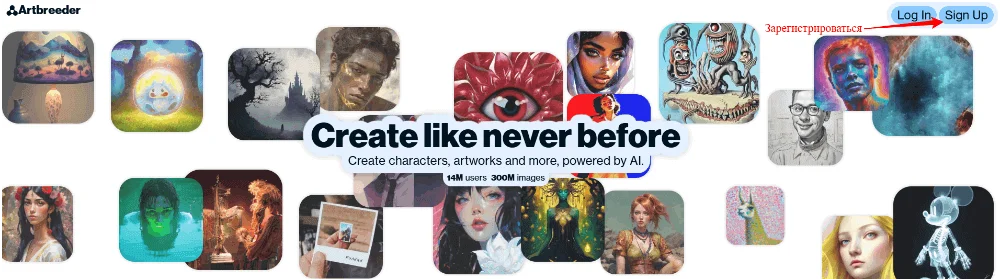 Для начала регистрируемся на официальном сайте Artbreeder. Нажимаем кнопку Sign Up в правом верхнем углу. Создать аккаунт можно через почту.