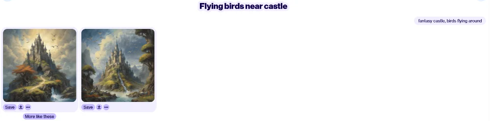 В нашем примере запрос — “fantasy castle, birds flying around”. Платформа создала 2 точных картинки: