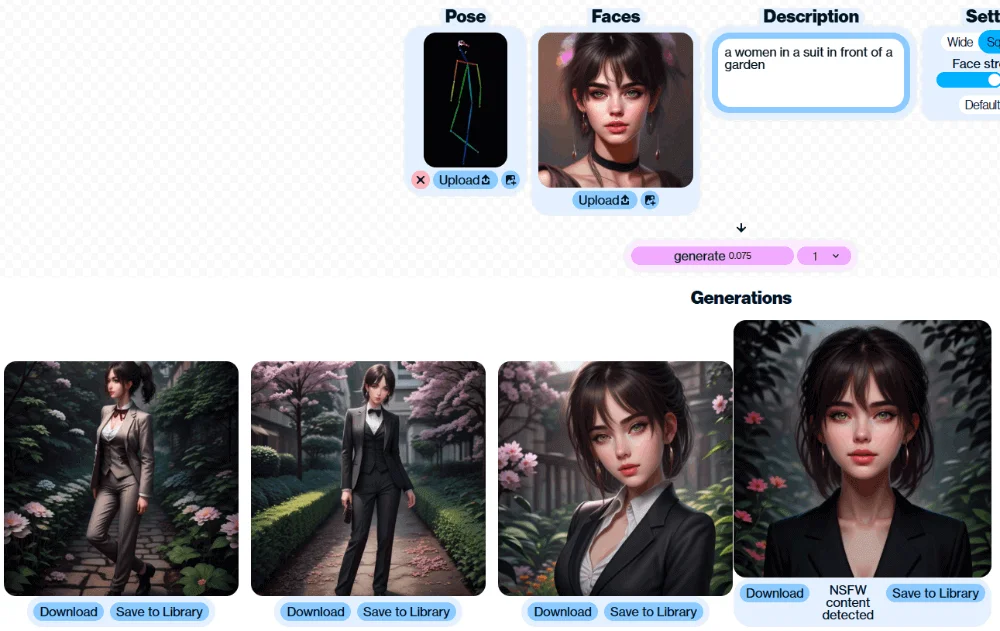 В рабочем поле — 4 окна настройки: выбор позы, изображение с лицом, тестовое описание и настройки генерации.