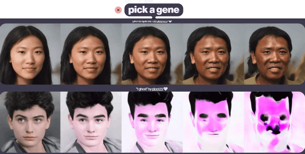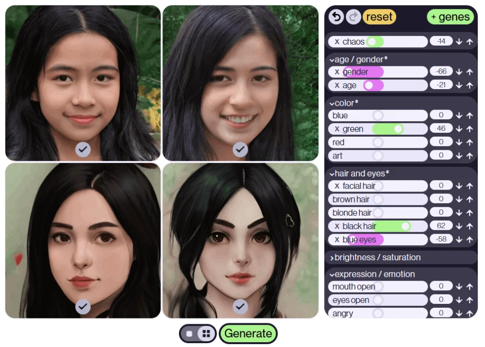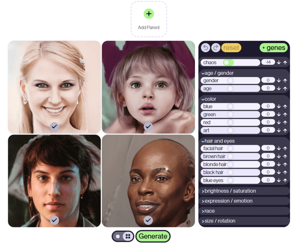 Особенность платформы Artbreeder в том, что она умеет «скрещивать» и «разделять» изображения. Недаром в названии есть слово “breed” — «выводить породу». Принцип работы редактора действительно чем-то похож на генетику: берем два изображения, совмещаем их и получаем новое. Или наоборот: из одной картинки создаем несколько других, «дочерних». Для генераций можно настраивать генетические особенности персонажа на изображении: например, пол, возраст.