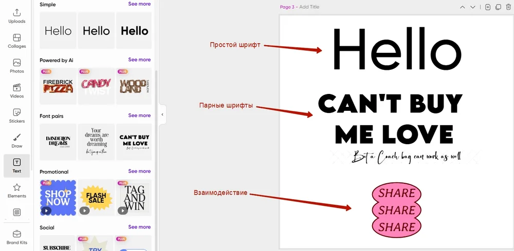 Текст. Сервис предлагает шаблоны для текстовых блоков разных типов: например, простые шрифты, парные шрифты, продающие надписи, графические элементы для взаимодействия в медиа.