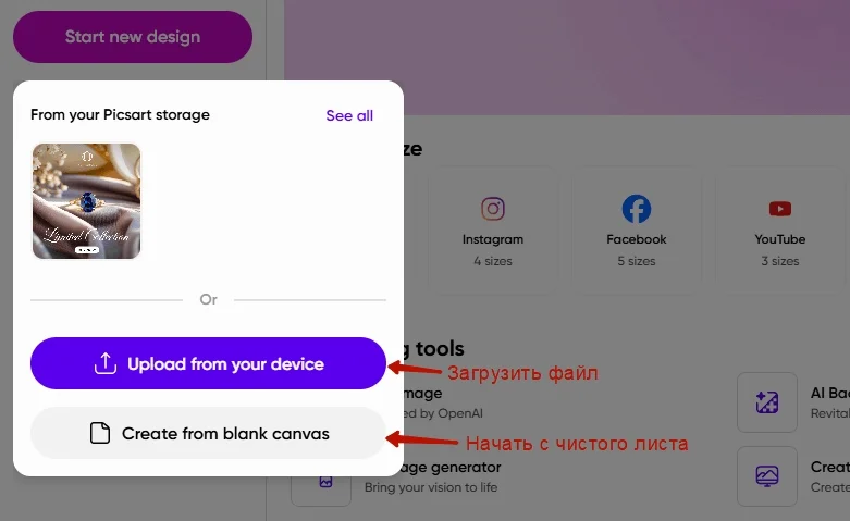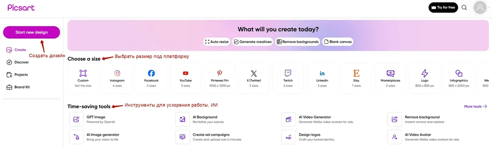 Далее нужно выбрать, с чего начать работу: задать размер визуала, попробовать ИИ-инструмент или сразу начать создавать дизайн вручную.