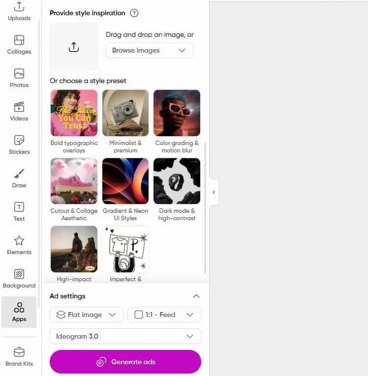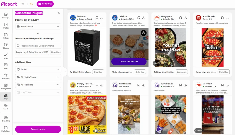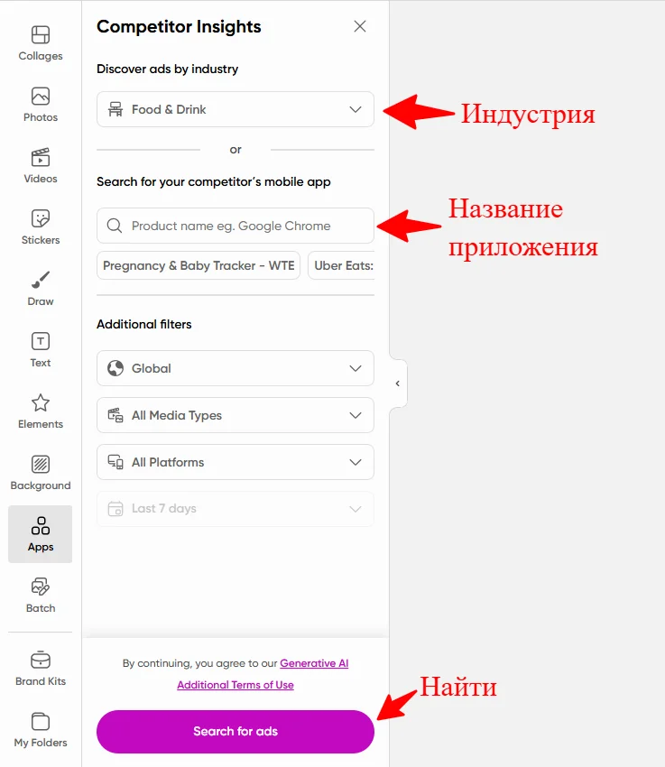 Подбор рекламы конкурентов для вдохновения. В Picsart есть функция Competitor Insights — поиск рекламных объявлений других компаний. Можно либо указать нишу, либо название мобильного приложения конкурента.