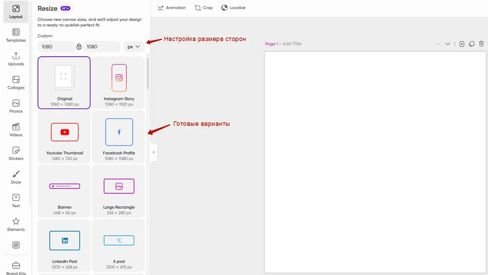Над макетами — поля для ручной настройки размера.
