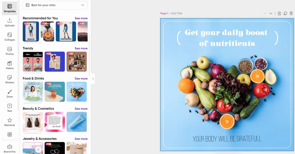 Бесплатного набора функций хватит для обработки личного контента, публикаций в соцсетях, создания простых презентаций. Сервис ориентирован на упрощение работы, и поэтому предлагает готовые шаблоны и макеты, ИИ-инструменты, массовое редактирование изображений.
