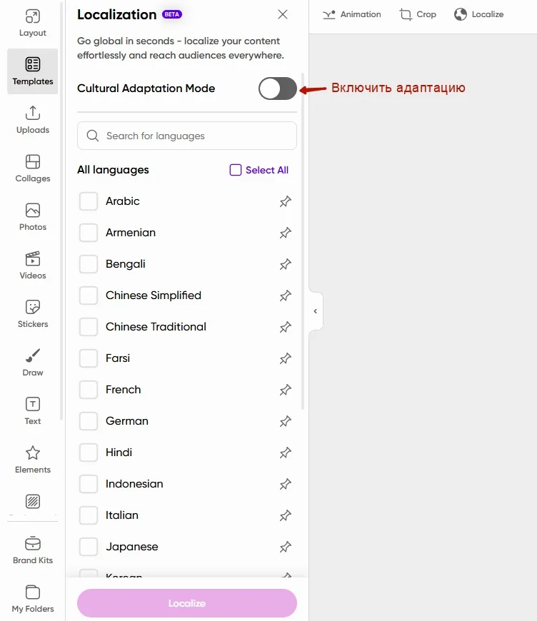 Примечательно,что платформа предоставляет специальные возможности для работы с рекламой: например, ИИ-генератор баннеров и инструмент для локализации креативов.