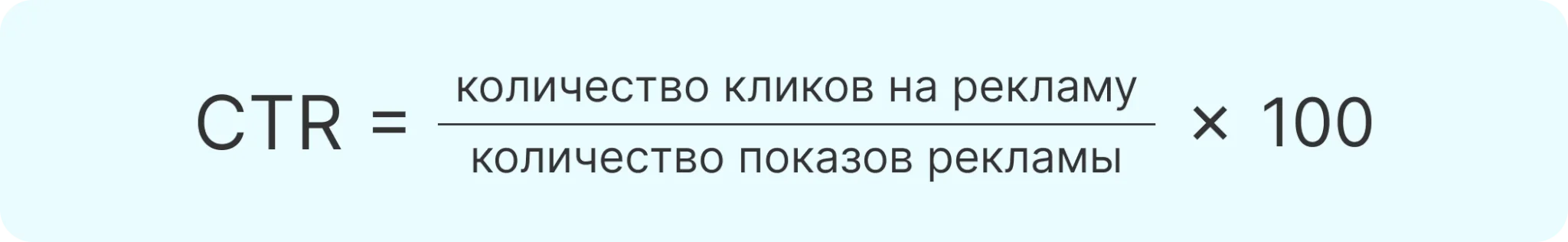 Отражает, сколько пользователей кликнули на рекламное объявление по сравнению с количеством показов. Параметр помогает оценить эффективность рекламы: чем выше CTR, тем интереснее объявление для аудитории. Результаты измеряются в процентах.