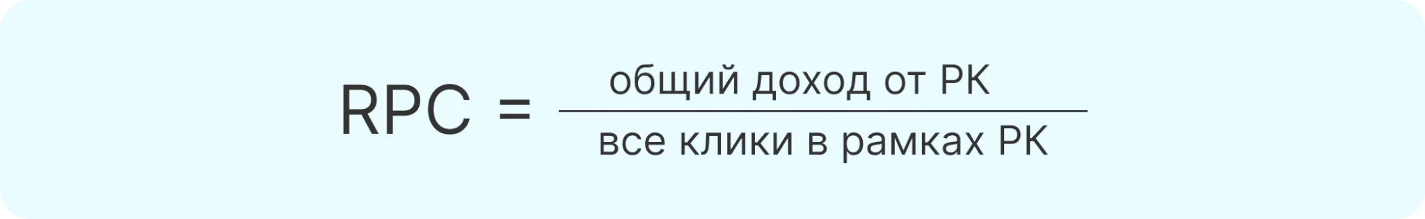 Показывает отношение дохода от рекламной кампании к общему количеству кликов по ней. Помогает оценить эффективность рекламы, но нужно сравнивать с другими показателями. Например, RPC должен быть больше CPC, потому что только в этом случае прибыль с каждого клика превышает расход на его получение. Усредненных значений RPC нет.