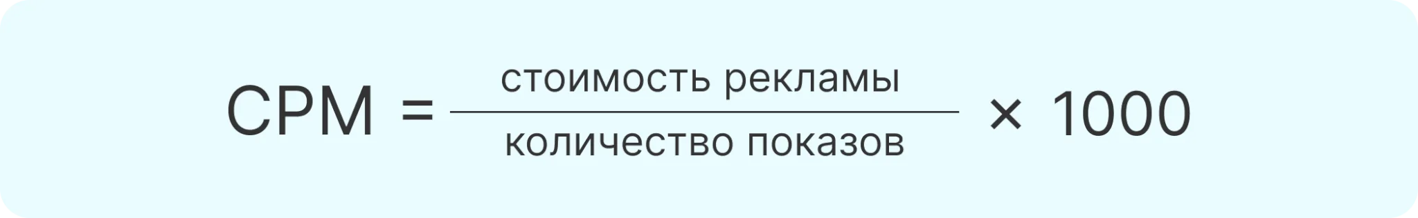 Отражает, сколько рекламодатель платит за тысячу показов рекламного объявления. Обычно метрику считают как показатель эффективности для медийной рекламы, но можно рассчитать и для контекстной и таргетированной.