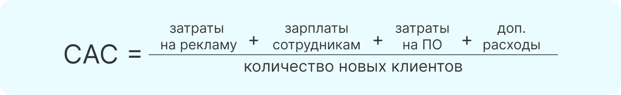Показывает общую стоимость привлечения клиента. Метрику можно считать отдельно по каналам, чтобы оценить эффективность каждого. Для расчета нужно учесть все затраты на лидогенерацию: расходы на рекламу, оборудование, зарплаты сотрудникам и т. д.
