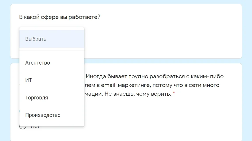 Раскрывающийся список. Если вариантов ответа слишком много, то лучше добавить вопрос с выбором ответа из раскрывающегося списка. При таком варианте вопроса можно будет выбрать только один ответ из перечисленных.