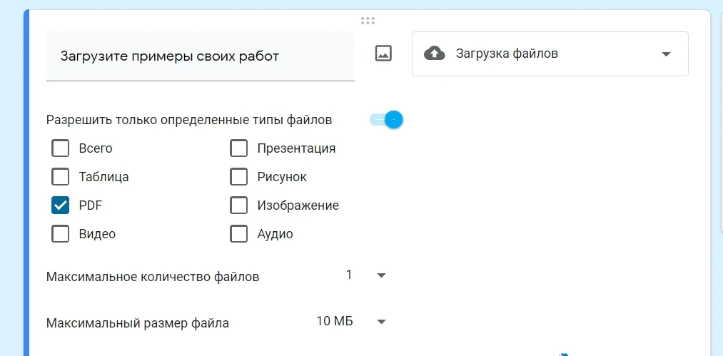 Через форму можно принимать файлы размером до 10 ГБ, общий допустимый размер всех загруженных файлов — 1 ТБ. Но его тоже можно уменьшать через настройки. При достижении лимита ответы приниматься не будут.