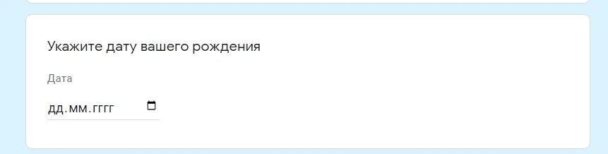 Дата. В качестве ответа респондент выбирает дату в календаре. Можно ограничиться только днем и месяцем или добавить также год и время в настройках, кликнув на три точки в правом нижнем углу блока с вопросом.