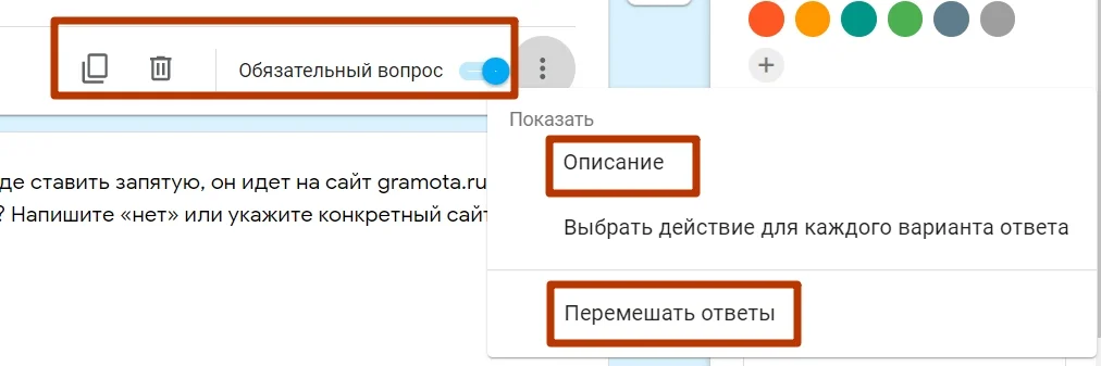 Каждый вопрос можно сделать обязательным, скопировать или удалить, а также добавить к нему описание и перемешать ответы.