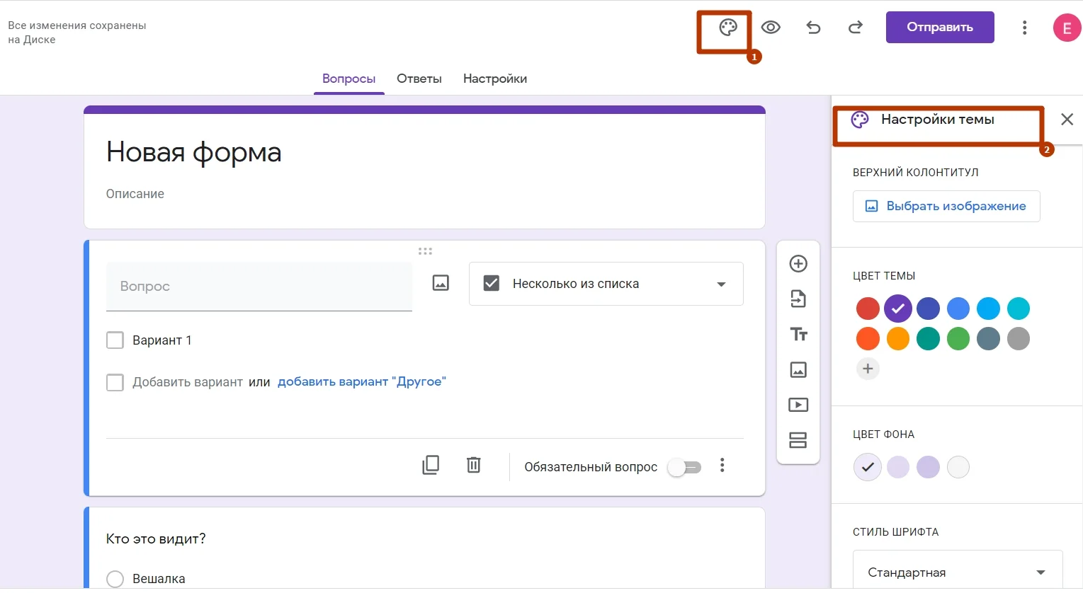 Внешний вид формы. Кликните на значок справа сверху. Откроется окно, в котором можно выбрать подходящий цвет темы и фона для вашей формы, шрифт и даже установить картинку на колонтитул.